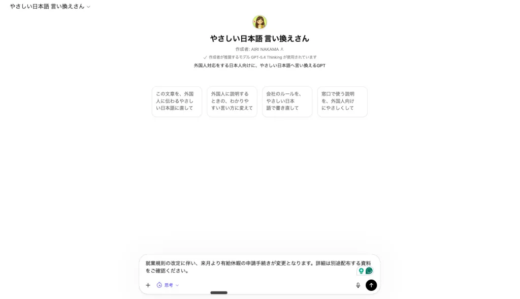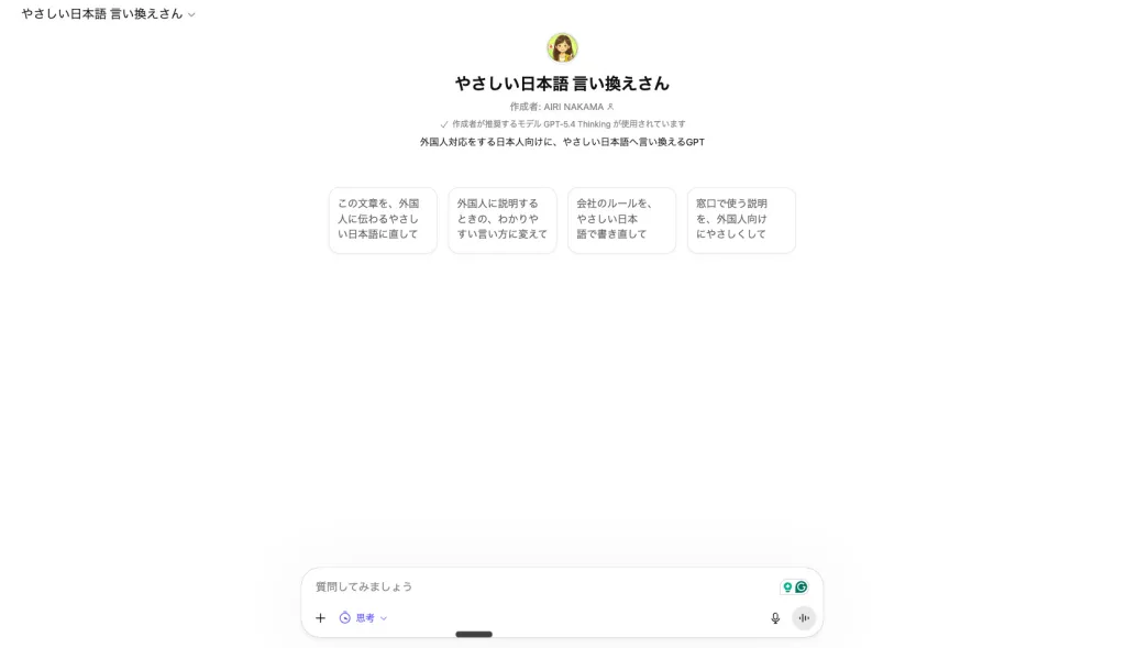 「やさしい日本語 言い換えさん」は、外国人対応で「伝わらない」を減らすためのGPTです。