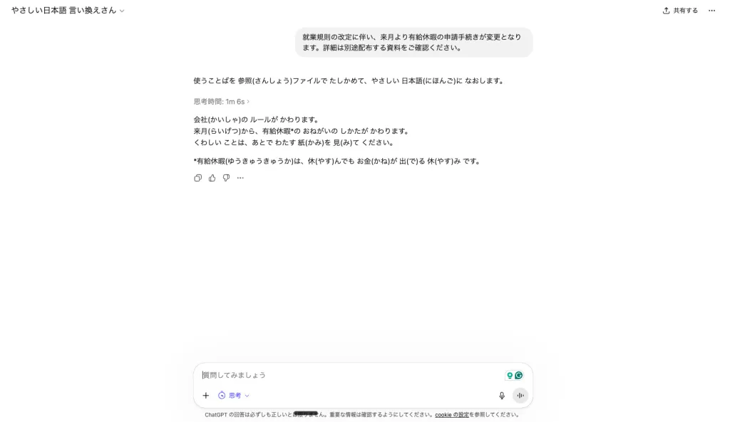 そこで今回、文章を入力するだけで、外国人にも伝わりやすい「やさしい日本語」に言い換えられるGPTを作りました。