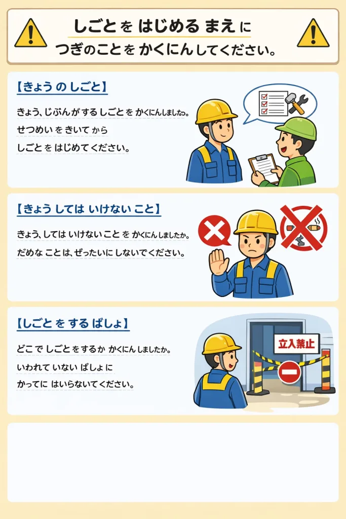 - 法律や安全に関わる内容は、必要に応じて対象者の母語への翻訳も併用してください。