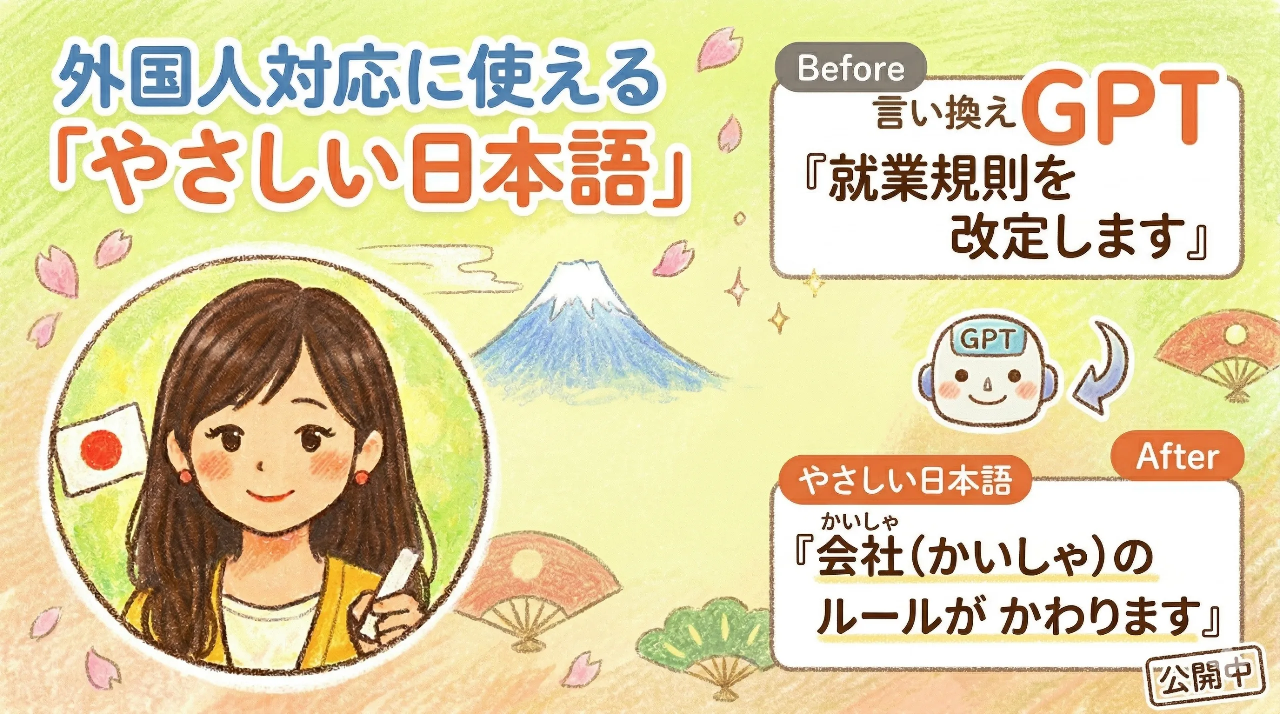 「やさしい日本語 言い換えさん」は、外国人対応で「伝わらない」を減らすためのGPTです。