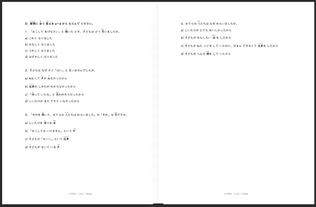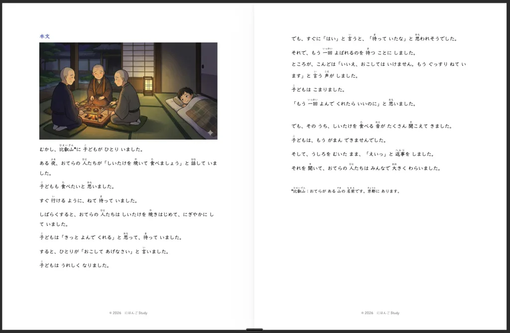 本文部分は極力、N5・N4レベルの日本語(語彙、文法、漢字)に変換しているので、初級後半〜中級レベルの学習者にぴったりの内容になっています。